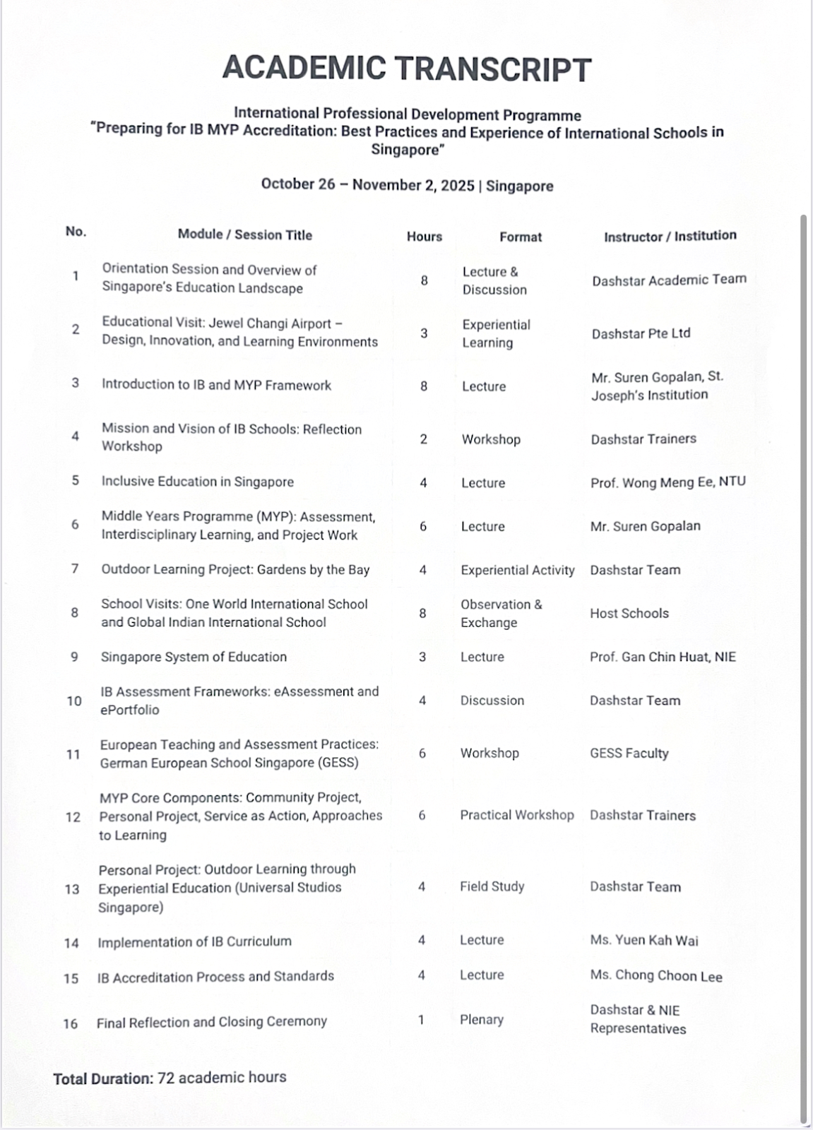 Сингапурдағы PD сессиясы IB авторизациясынан өту процесін, соның ішінде талаптарды, озық тәжірибелерді және сәтті енгізу стратегияларын түсінуге бағытталды. Сессияның мақсаты мектеп қызметкерлерін IB бағалауына дайындалу және IB стандарттарына сәйкестікті қамтамасыз ету үшін білім мен нұсқаулықпен қамтамасыз ету болды.