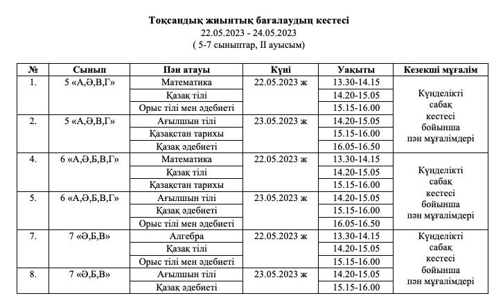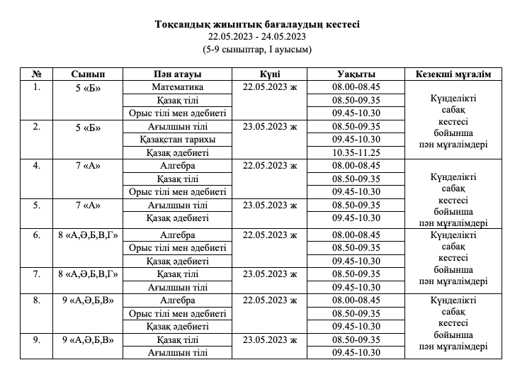 1-сыныпқа құжаттарды қабылдау жұмыс кестесі