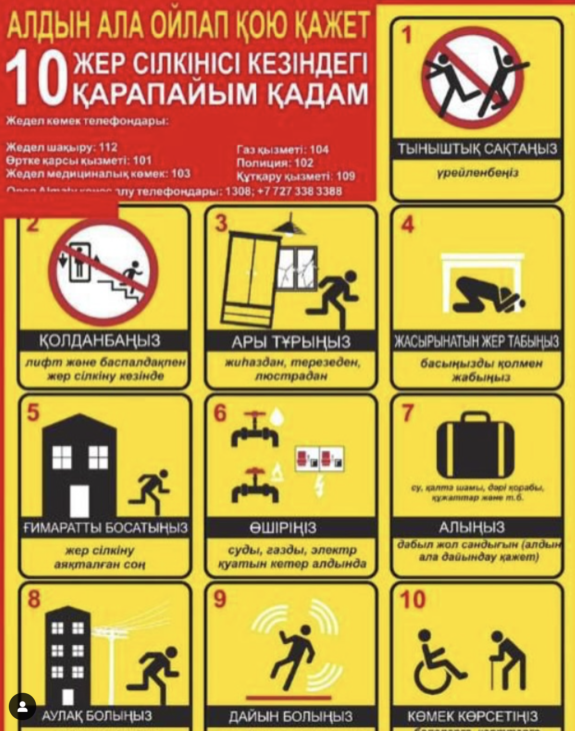 08 январь 2025 0 1 2 3 4 5 Жер сілкінісі кезіндегі 10 қарапайым қадам Жер сілкінісі кезіндегі 10 қарапайым қадам және тұрмыстағы өрт қауіпсіздік ережелерін сақтау