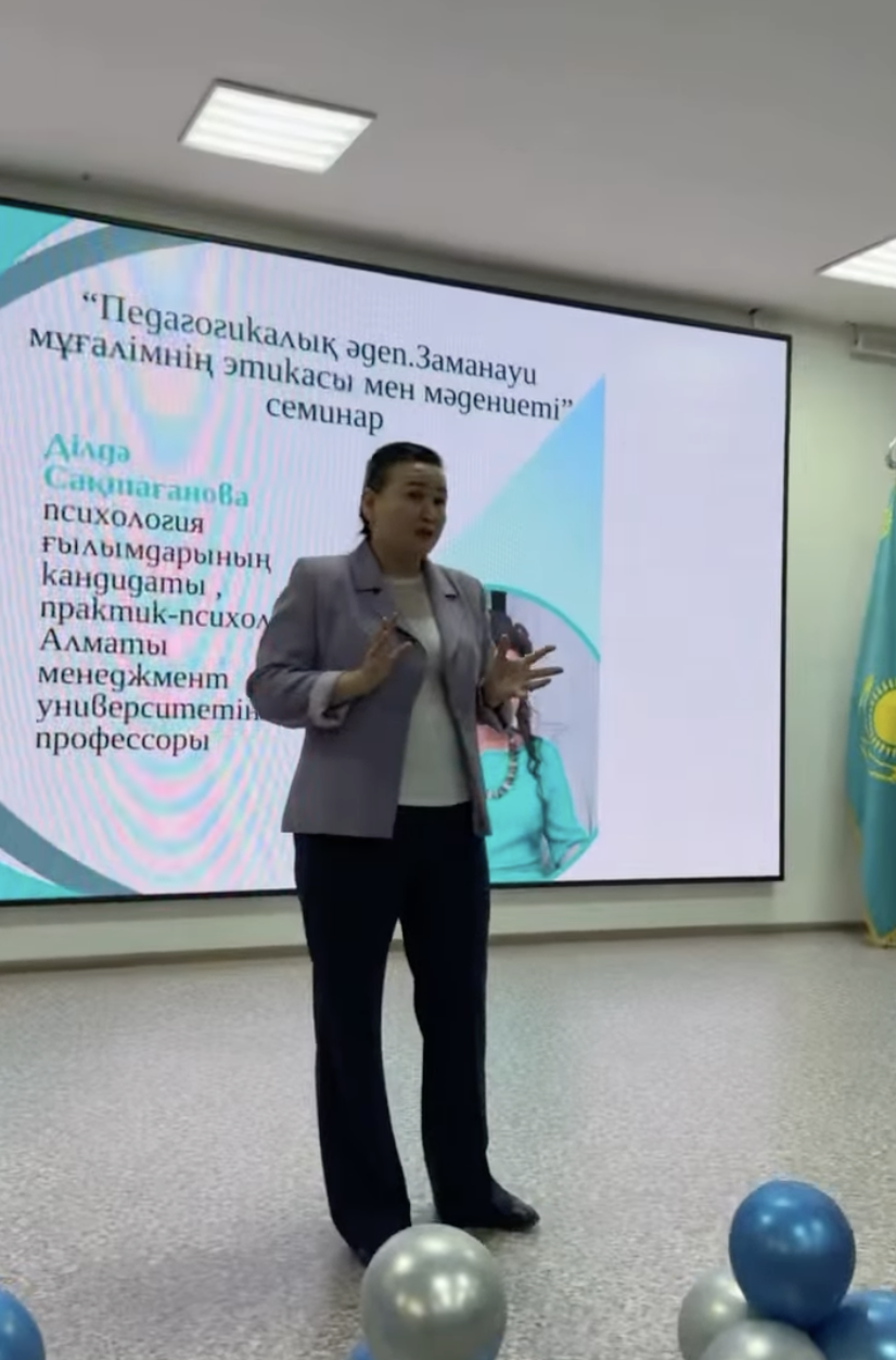 «ПЕДАГОГИКАЛЫҚ ӘДЕП, ЗАМАНАУИ МҰҒАЛІМНІҢ ЭТИКАСЫ ЖӘНЕ МӘДЕНИЕТІ» тақырыбында мектебіміздің ұжымына семинар өткізілді. Семинарға психология ғылымдарының кандидаты, практик - психолог, Алматы менеджмент университетінің профессоры Сақтағанова Ділдә Сәрсенқызы , Алатау ауданының Білім бөлімі әдіскерлері Смағулова Алия Белгібаевна , Адамбекова Рита Омаровна қатысты. Семинарда мұғалімдерге педагогикалық әдептің ережелері, қағидаттары мен нормалары туралы айтылды. Педагогикалық әдептілік – бұл мұғалімнің педагогикалық ұжымда, оқушылармен және олардың ата-аналарымен абыройлы және ұстамды болу қабілеті. Сонымен қатар балаларға жан-жақты әсер ету, олармен ортақ тіл табысып, бір көзқараста бола отырып, оңтайлы тәрбиелік қатынастар құру мүмкіндігі. Педагогикалық әдептіліктің белгілері мен элементтері бар. Педагогикалық әдептіліктің басты белгісі – бұл мұғалімнің жеке басының адамгершілік мәдениеті, қарым-қатынас процесінде мұғалім мен оқушылардың арасындағы қарым-қатынасты тиімді жүзеге асыру.