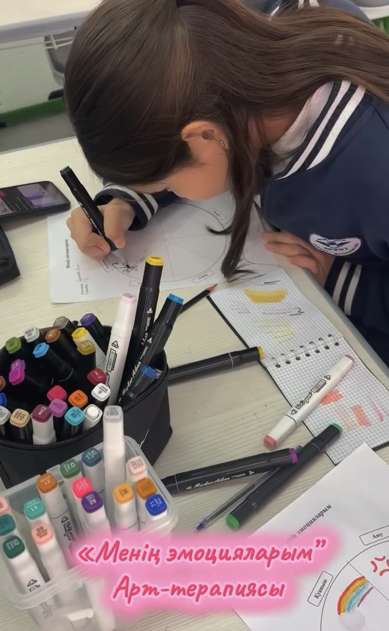 Арт-терапиялық жаттығу барысында оқушылар өздерінің эмоцияларын қалай елестететіндерін қағаз бетіне бейнелеп,өз ойларымен бөлісті