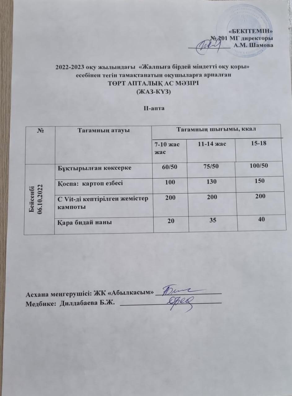 12 октябрь 2022 0 1 2 3 4 5 2022-2023 оқу жылындағы "Жалпыға бірдей міндетті оқу қоры" есебінен тегін тамақтанатын оқушыларға арналған Ас мәзірі