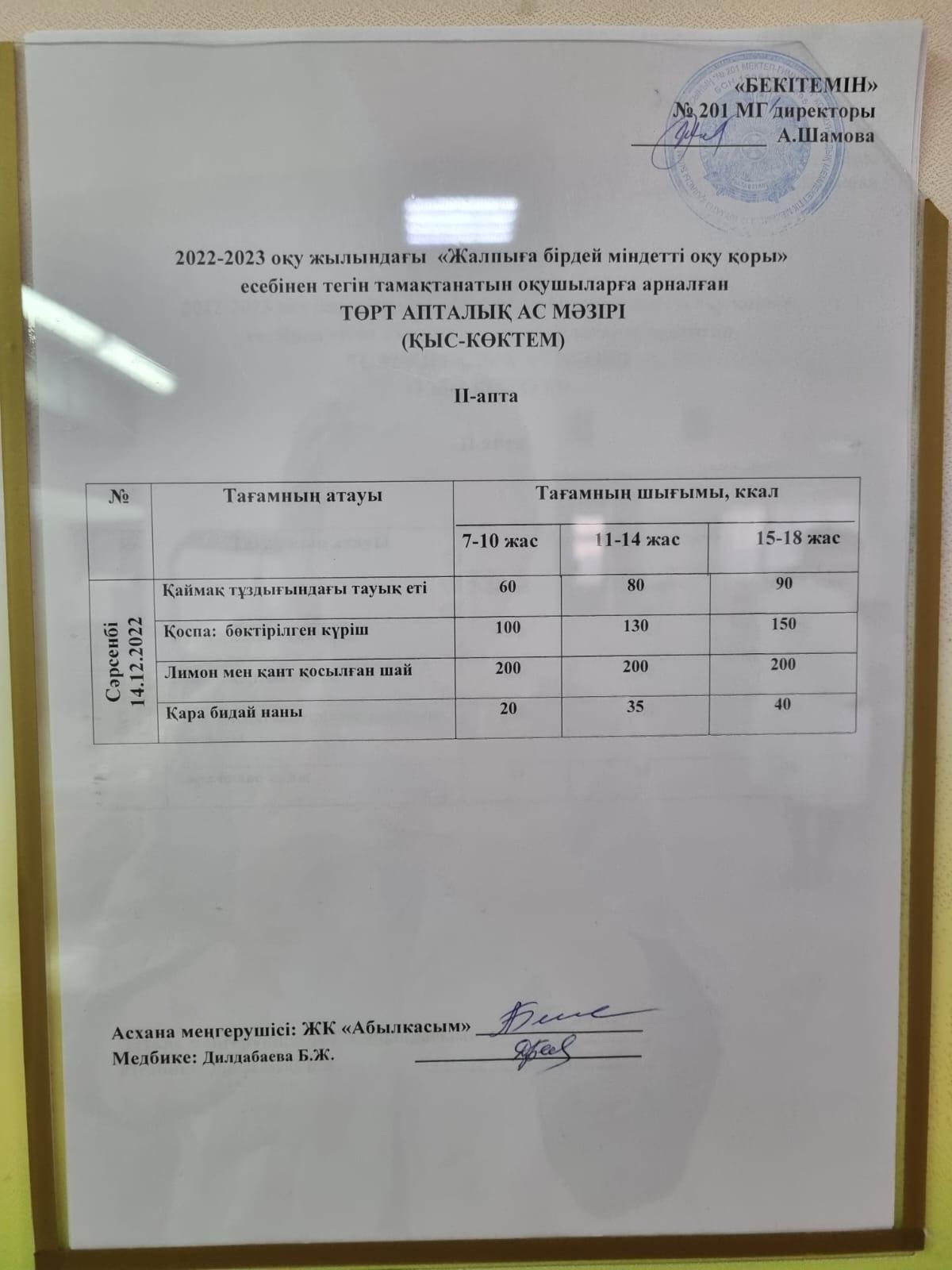 14 декабрь 2022 0 1 2 3 4 5 2022-2023 оқу жылындағы "Жалпыға бірдей міндетті оқу қоры" есебінен тегін тамақтанатын оқушыларға арналған ТӨРТ АПТАЛЫҚ АС МӘЗІРІ