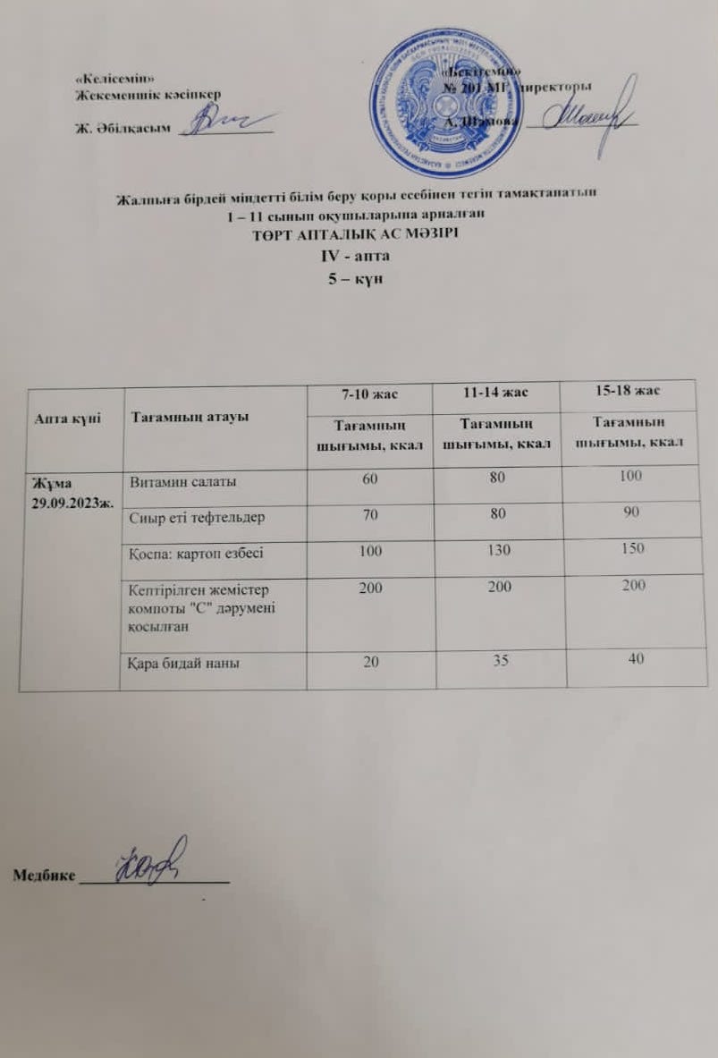 29 сентябрь 2023 0 1 2 3 4 5 Жалпыға бірдей міндетті білім беру қоры есебінен тегін тамақтанатын 1-11 сынып оқушыларына арналған ас мәзірі