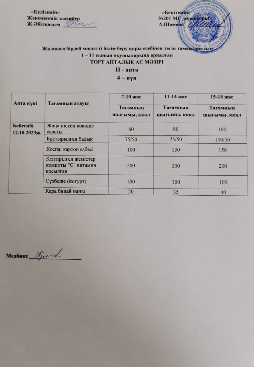 12 октябрь 2023 0 1 2 3 4 5 Жалпыға бірдей міндетті білім беру қоры есебінен тегін тамақтанатын 1-11 сынып оқушыларына арналған ас мәзірі