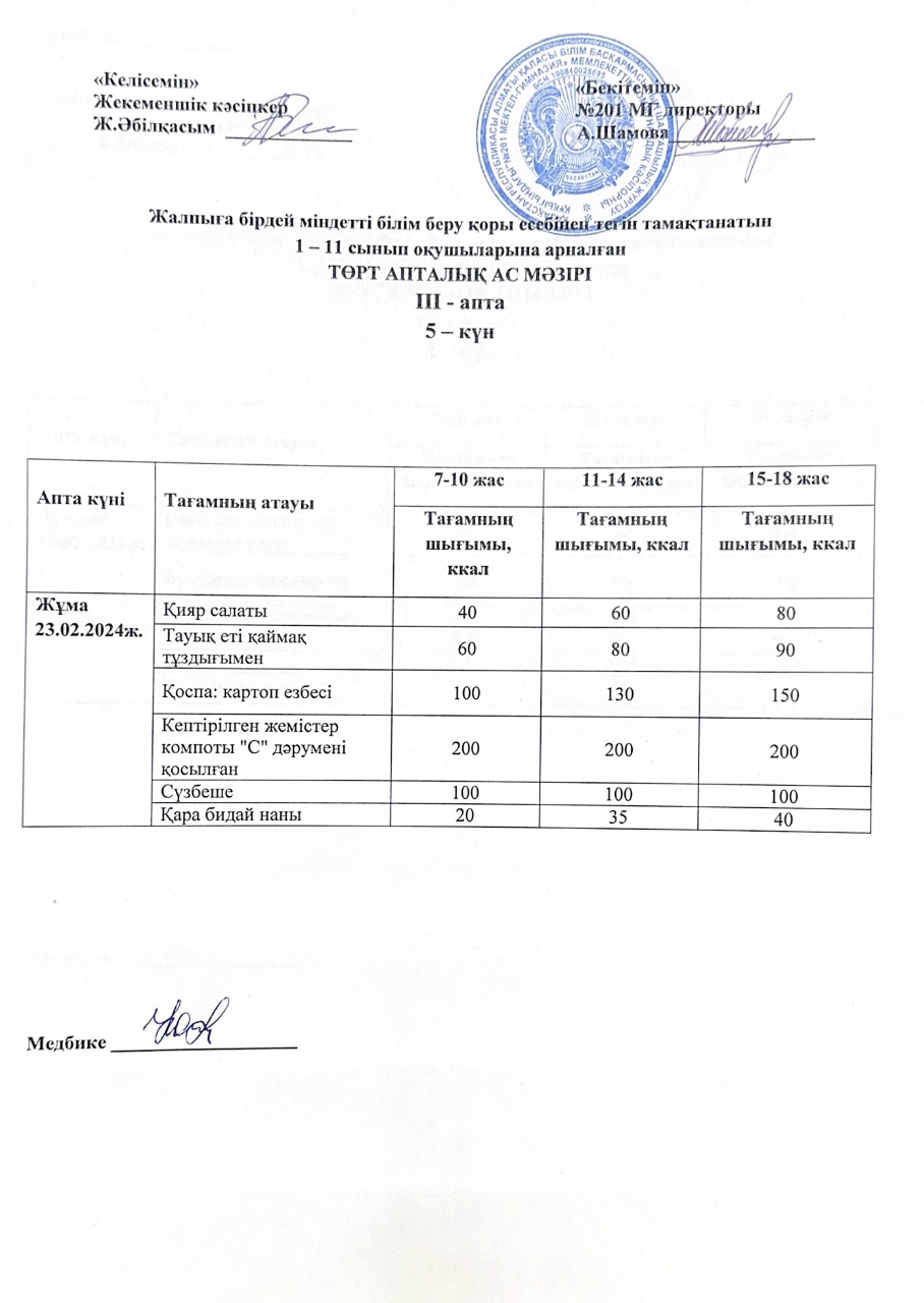 23 февраль 2024 0 1 2 3 4 5 Жалпыға бірдей міндетті білім беру қоры есебінен тегін тамақтанатын 1-11 сынып оқушыларына арналған ас мәзірі