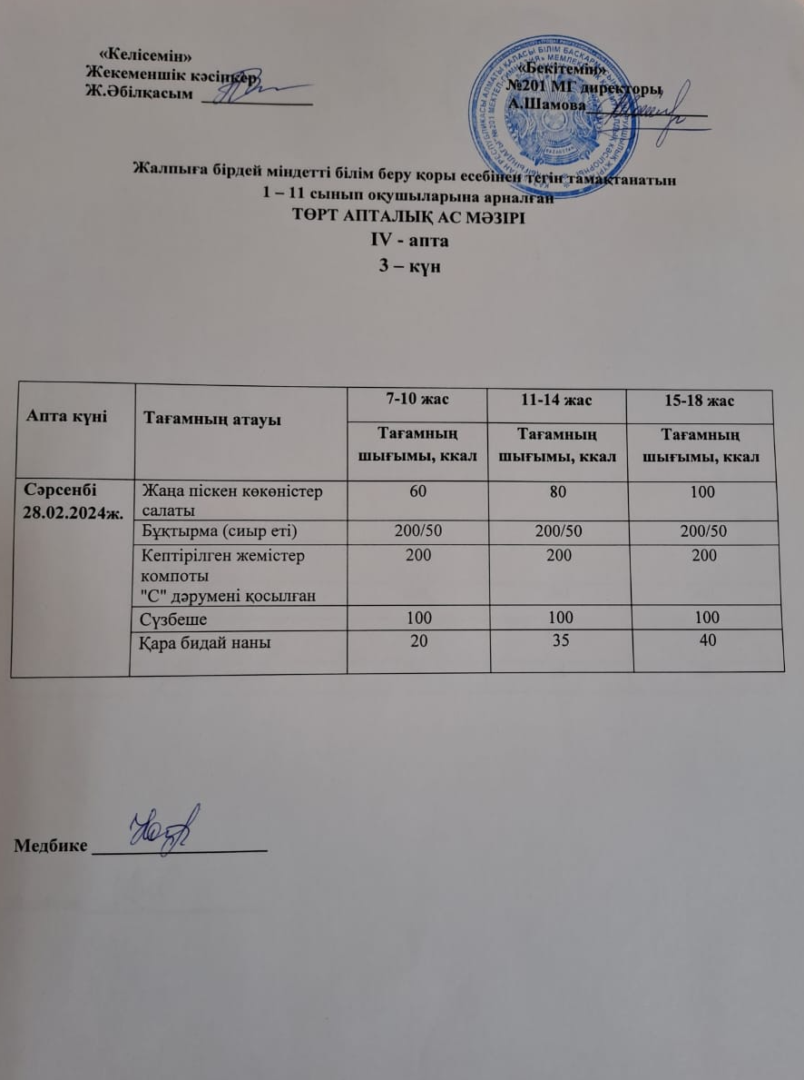 28 февраль 2024 0 1 2 3 4 5 Жалпыға бірдей міндетті білім беру қоры есебінен тегін тамақтанатын 1-11 сынып оқушыларына арналған ас мәзірі