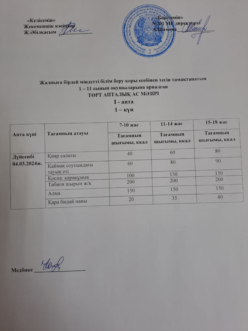 04 март 2024 0 1 2 3 4 5 Жалпыға бірдей міндетті білім беру қоры есебінен тегін тамақтанатын 1-11 сынып оқушыларына арналған ас мәзірі