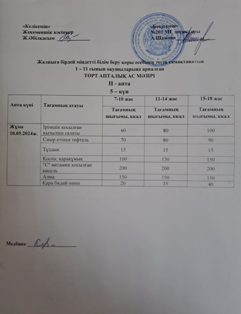 10 май 2024 0 1 2 3 4 5 Жалпыға бірдей міндетті білім беру қоры есебінен тегін тамақтанатын 1-11 сынып оқушыларына арналған ас мәзірі
