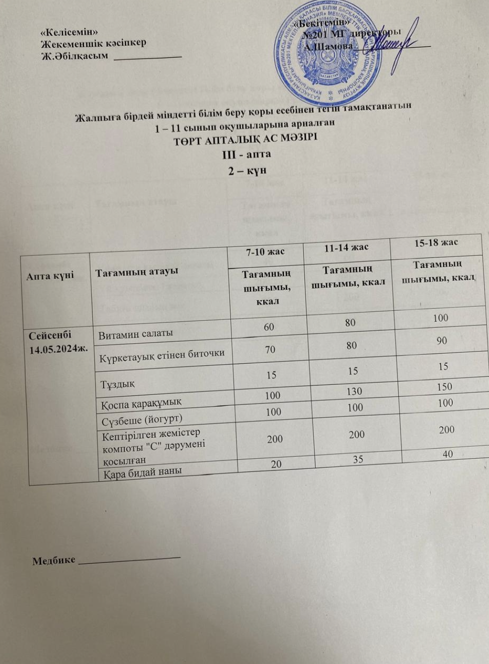 14 май 2024 0 1 2 3 4 5 Жалпыға бірдей міндетті білім беру қоры есебінен тегін тамақтанатын 1-11 сынып оқушыларына арналған ас мәзірі