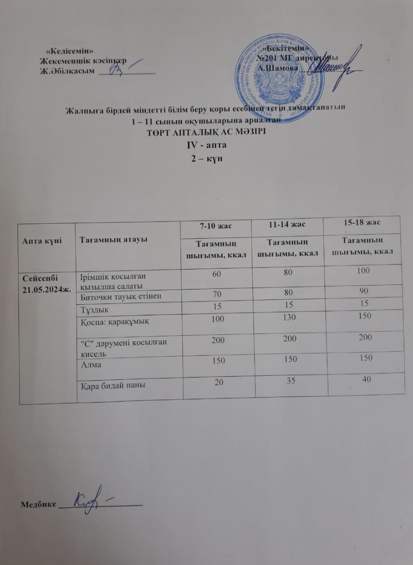 21 май 2024 0 1 2 3 4 5 Жалпыға бірдей міндетті білім беру қоры есебінен тегін тамақтанатын 1-11 сынып оқушыларына арналған ас мәзірі