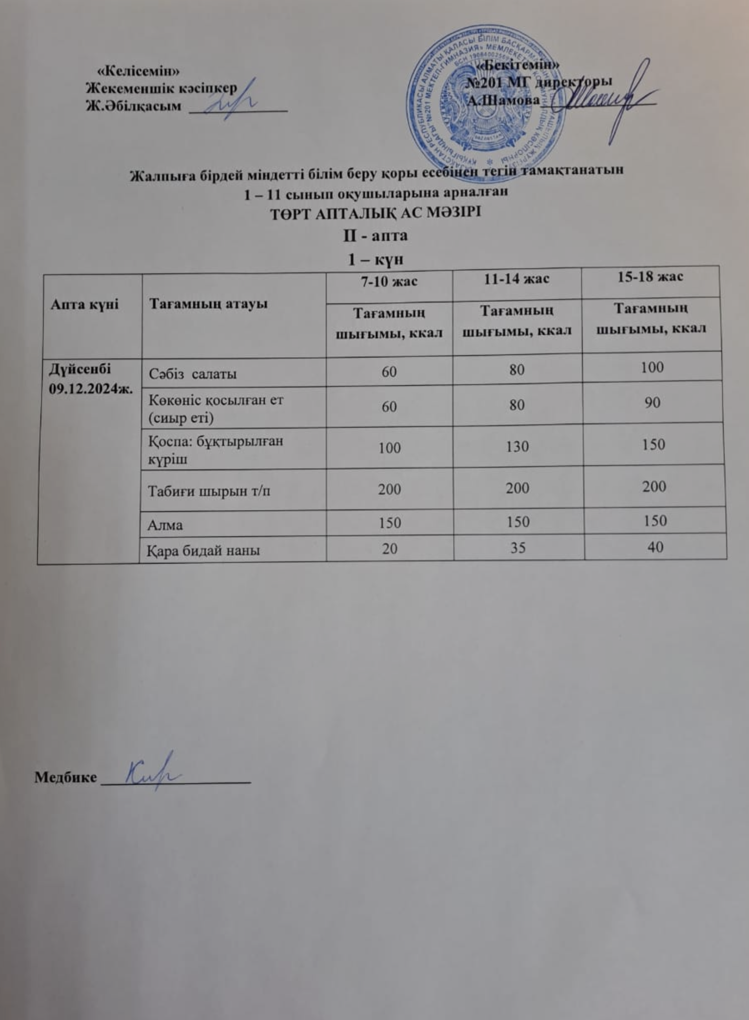 09 декабрь 2024 0 1 2 3 4 5 Жалпыға бірдей міндетті білім беру қоры есебінен тегін тамақтанатын 1-11 сынып оқушыларына арналған ас мәзірі