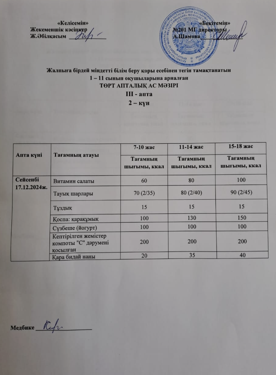 17 декабрь 2024 0 1 2 3 4 5 Жалпыға бірдей міндетті білім беру қоры есебінен тегін тамақтанатын 1-11 сынып оқушыларына арналған ас мәзірі