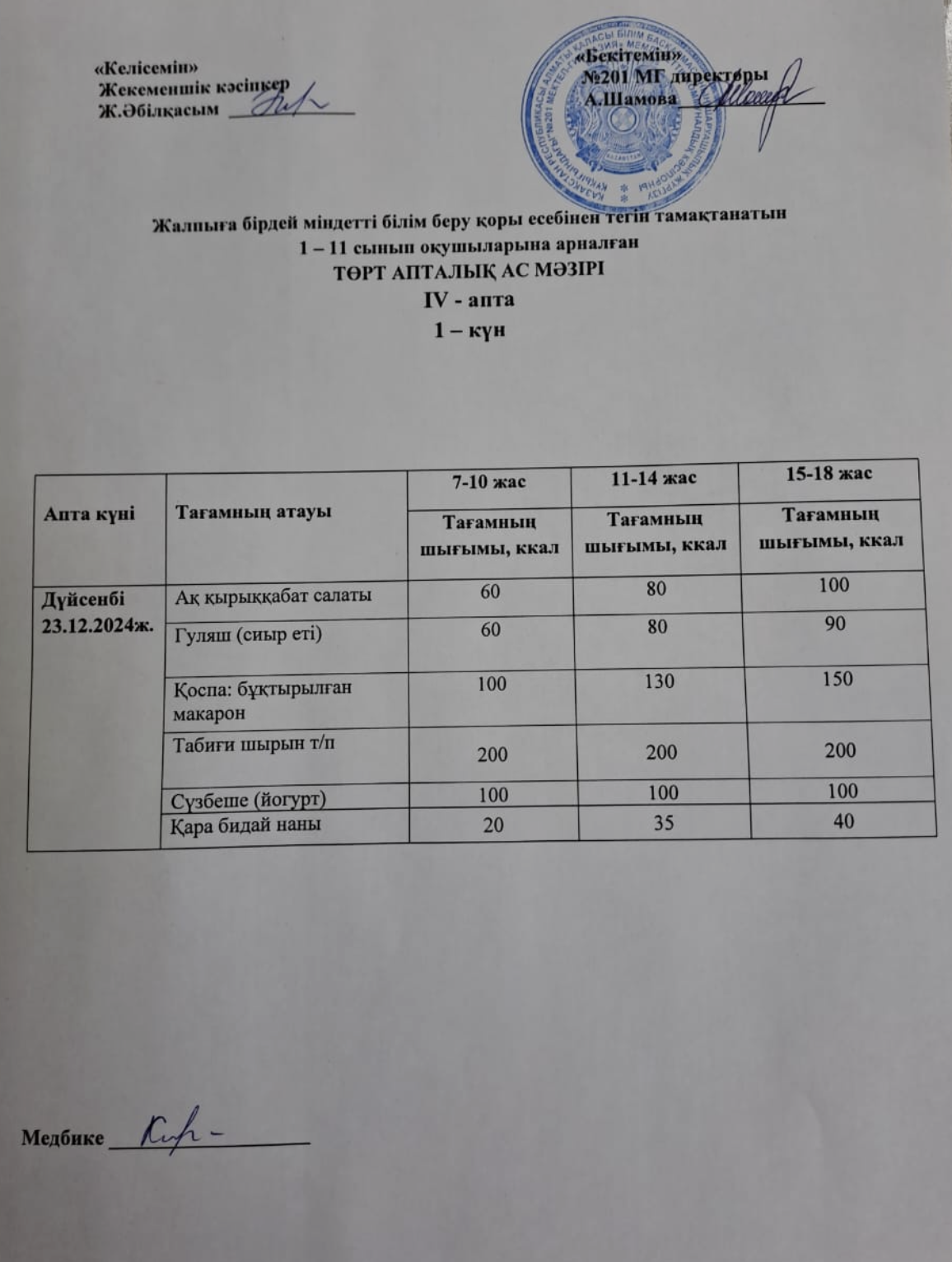 23 декабрь 2024 0 1 2 3 4 5 Жалпыға бірдей міндетті білім беру қоры есебінен тегін тамақтанатын 1-11 сынып оқушыларына арналған ас мәзірі
