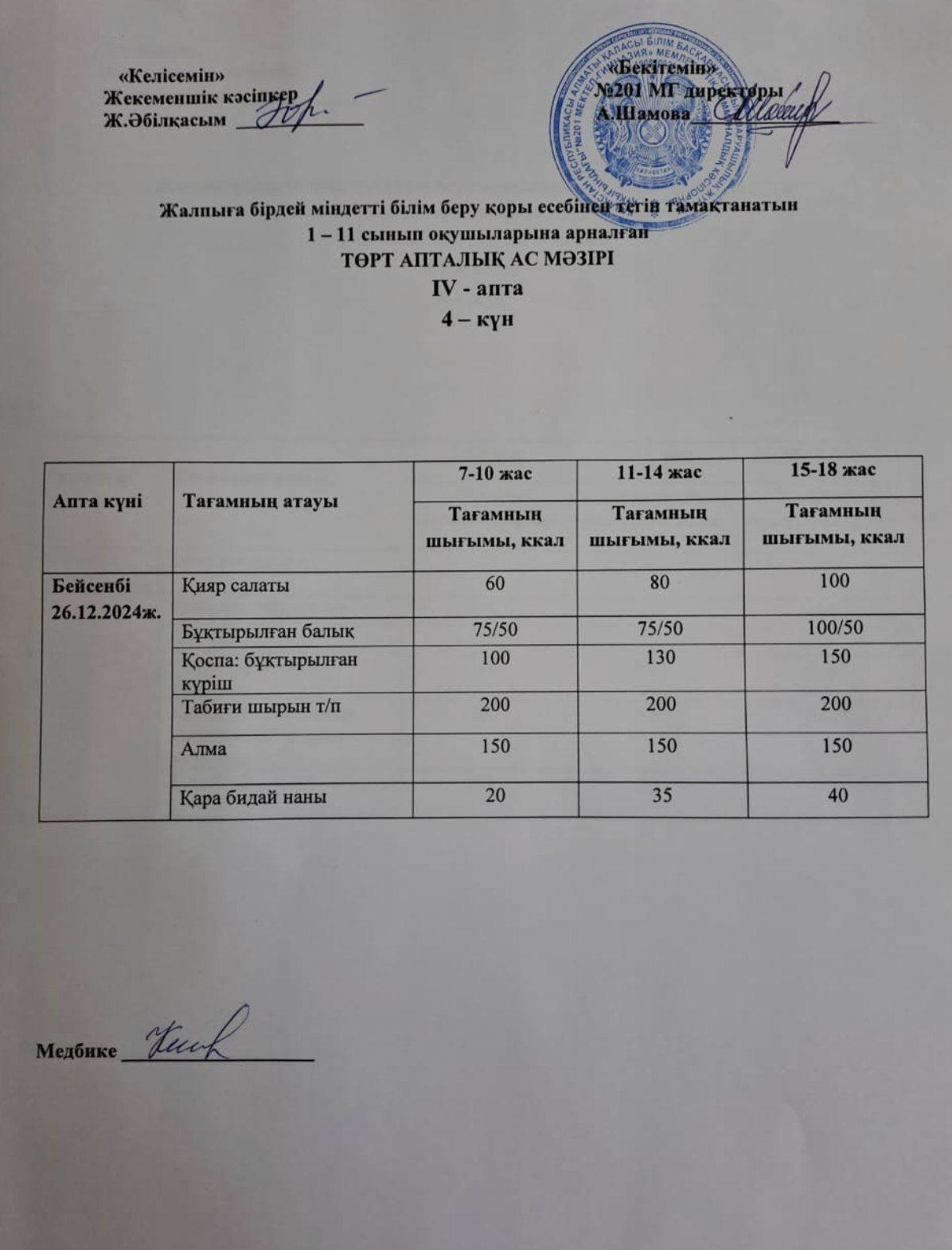 26 декабрь 2024 0 1 2 3 4 5 Жалпыға бірдей міндетті білім беру қоры есебінен тегін тамақтанатын 1-11 сынып оқушыларына арналған ас мәзірі