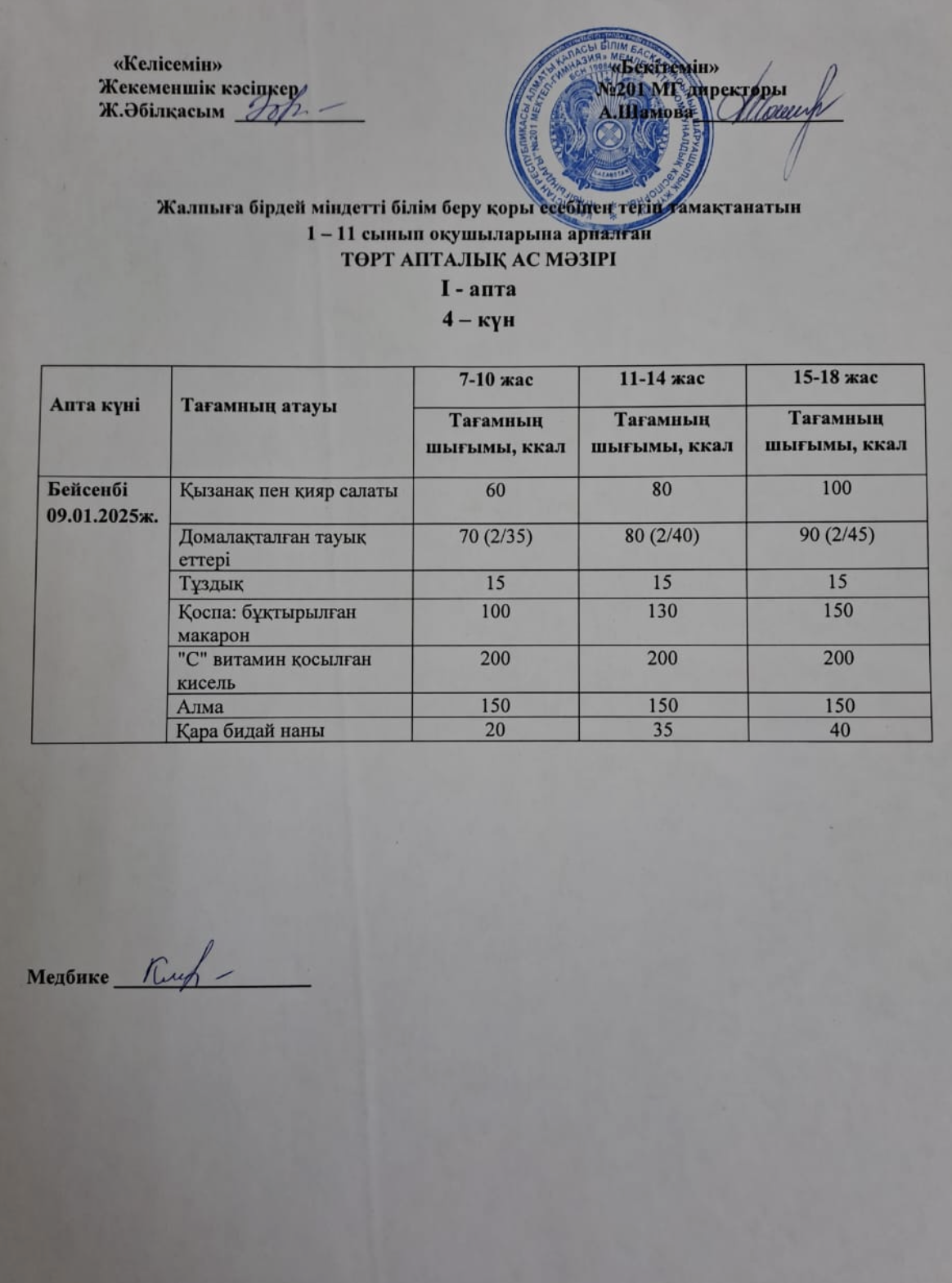 09 январь 2025 0 1 2 3 4 5 Жалпыға бірдей міндетті білім беру қоры есебінен тегін тамақтанатын 1-11 сынып оқушыларына арналған ас мәзірі