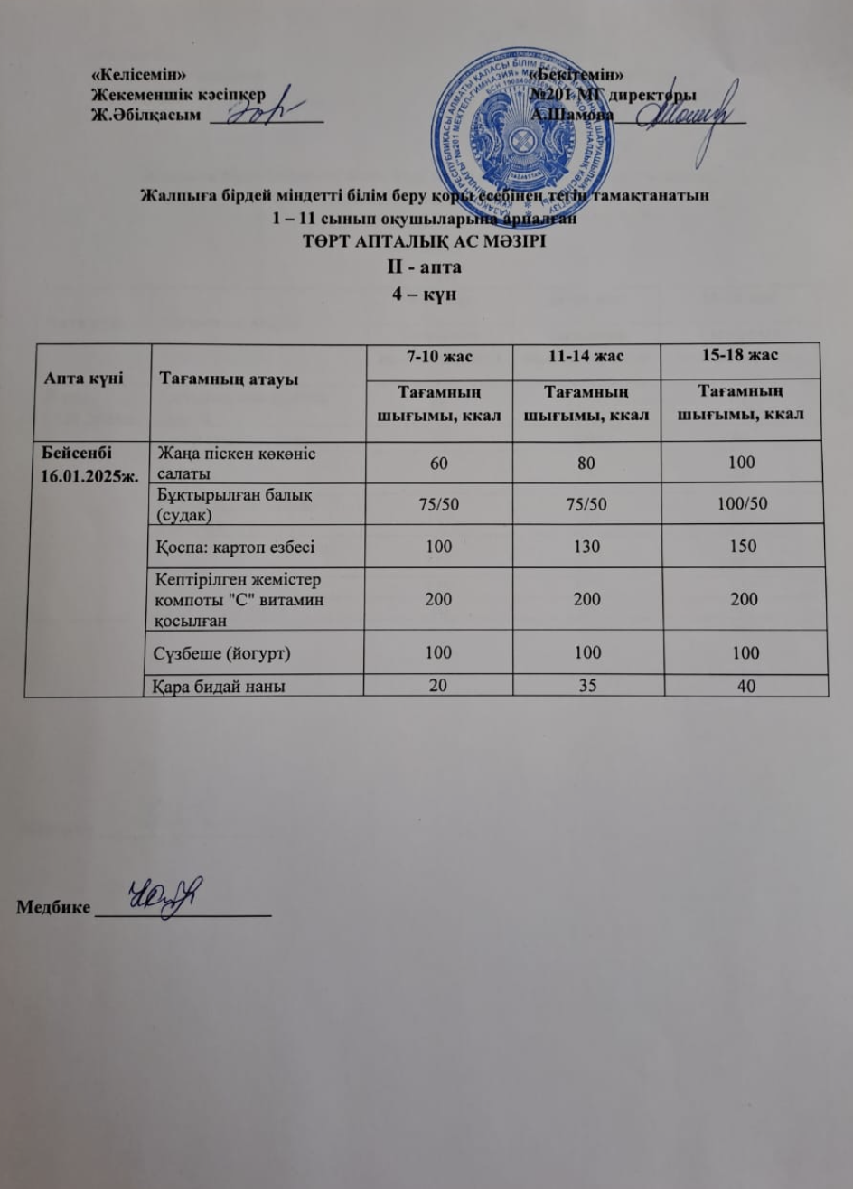 16 январь 2025 0 1 2 3 4 5 Жалпыға бірдей міндетті білім беру қоры есебінен тегін тамақтанатын 1-11 сынып оқушыларына арналған ас мәзірі