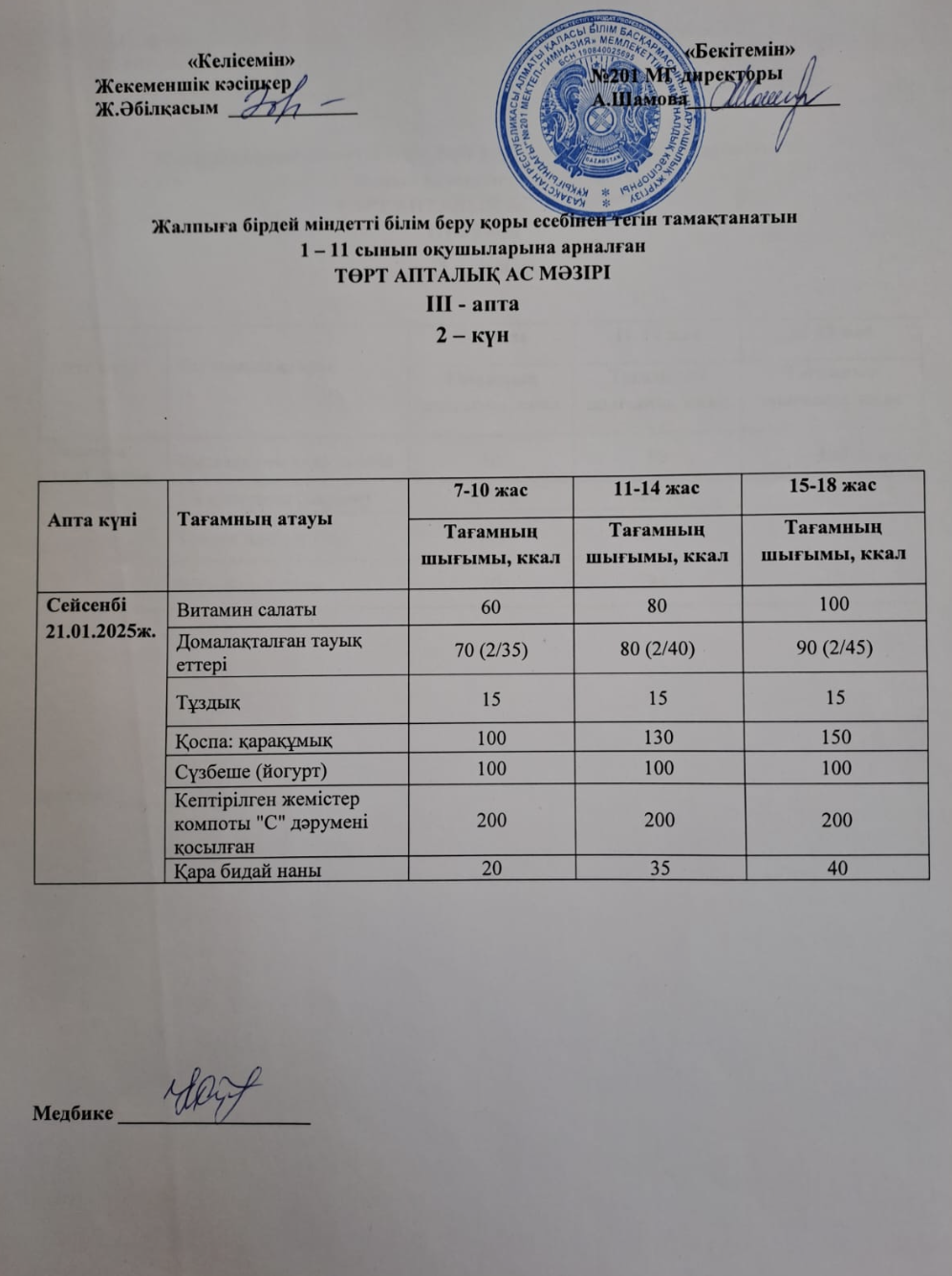 21 январь 2025 0 1 2 3 4 5 Жалпыға бірдей міндетті білім беру қоры есебінен тегін тамақтанатын 1-11 сынып оқушыларына арналған ас мәзірі