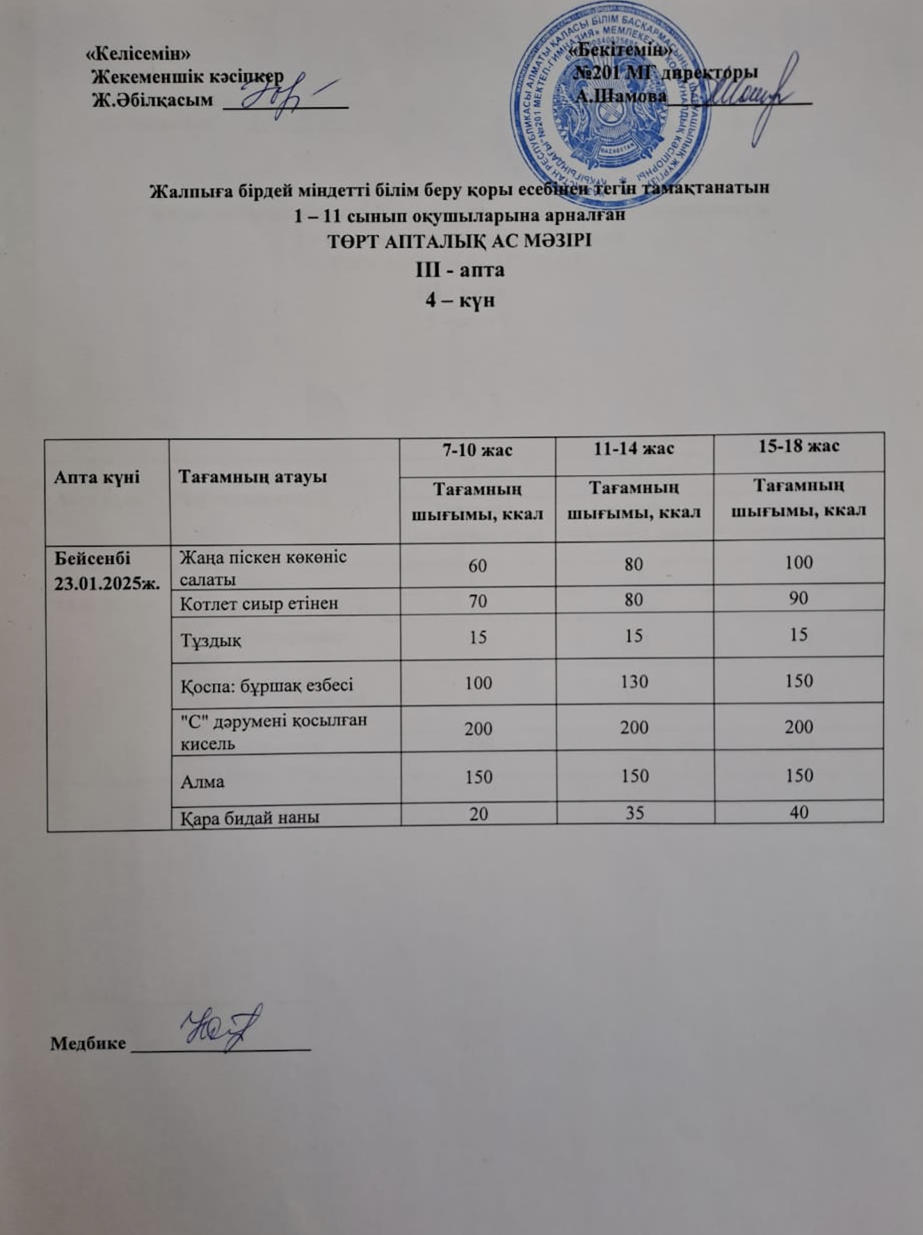 23 январь 2025 0 1 2 3 4 5 Жалпыға бірдей міндетті білім беру қоры есебінен тегін тамақтанатын 1-11 сынып оқушыларына арналған ас мәзірі