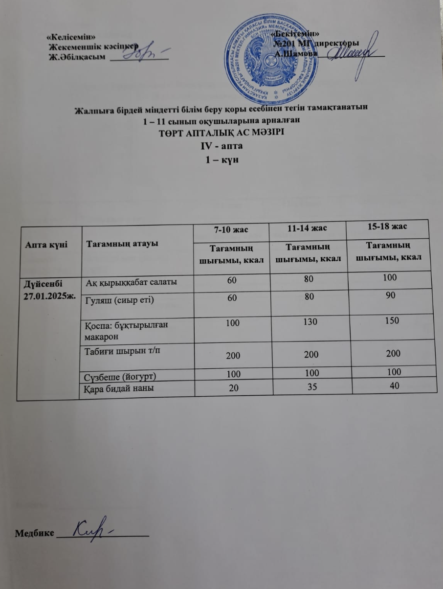 27 январь 2025 0 1 2 3 4 5 Жалпыға бірдей міндетті білім беру қоры есебінен тегін тамақтанатын 1-11 сынып оқушыларына арналған ас мәзірі
