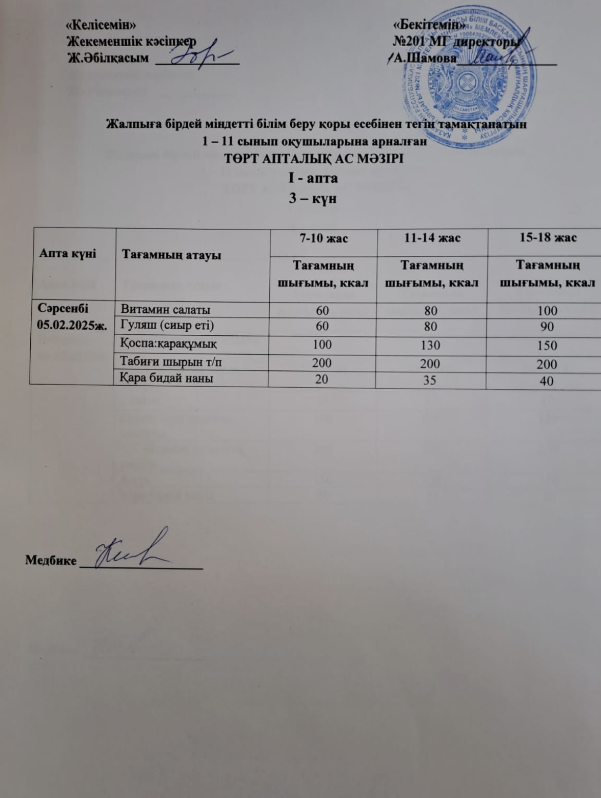 05 февраль 2025 0 1 2 3 4 5 Жалпыға бірдей міндетті білім беру қоры есебінен тегін тамақтанатын 1-11 сынып оқушыларына арналған ас мәзірі
