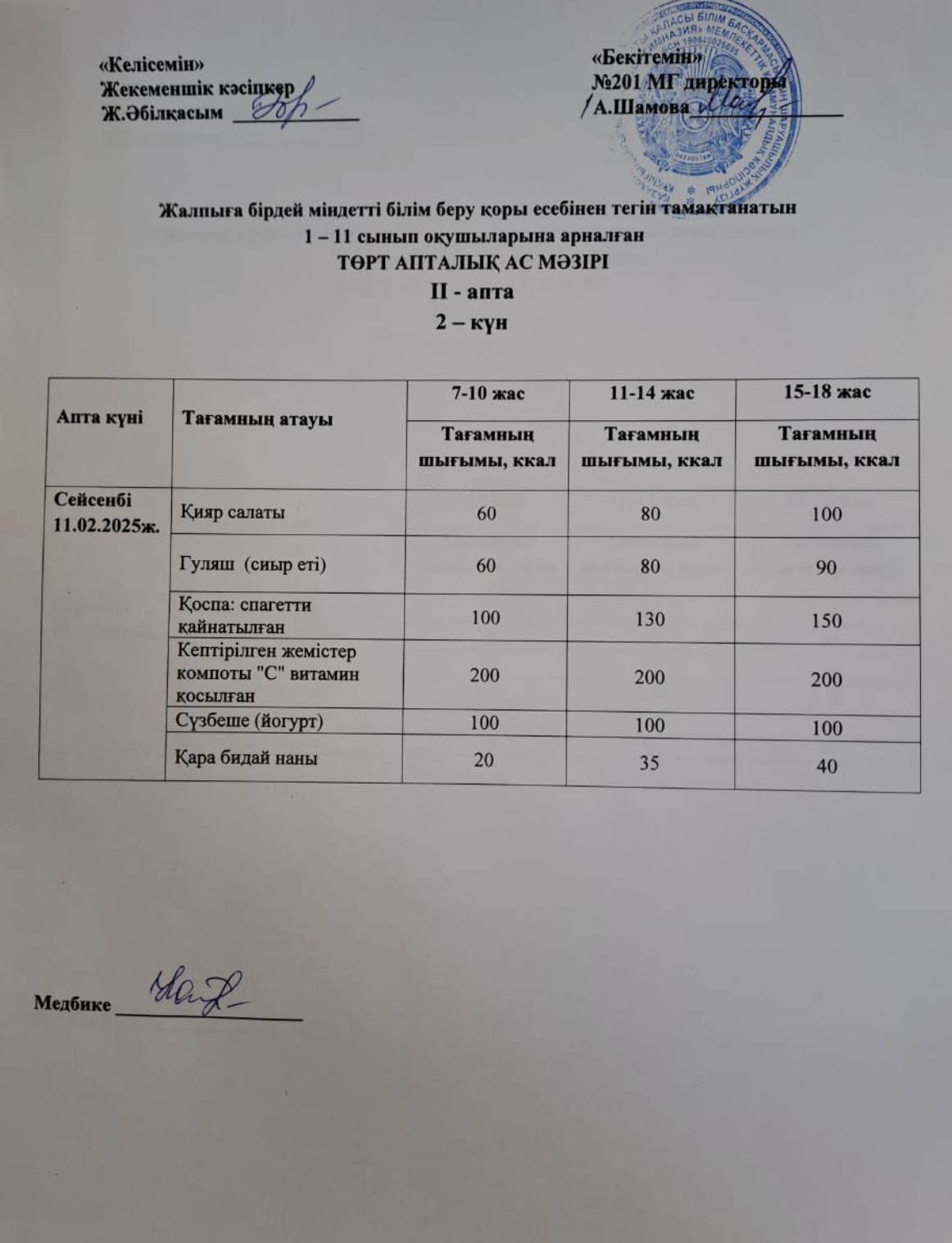 11 февраль 2025 0 1 2 3 4 5 Жалпыға бірдей міндетті білім беру қоры есебінен тегін тамақтанатын 1-11 сынып оқушыларына арналған ас мәзірі
