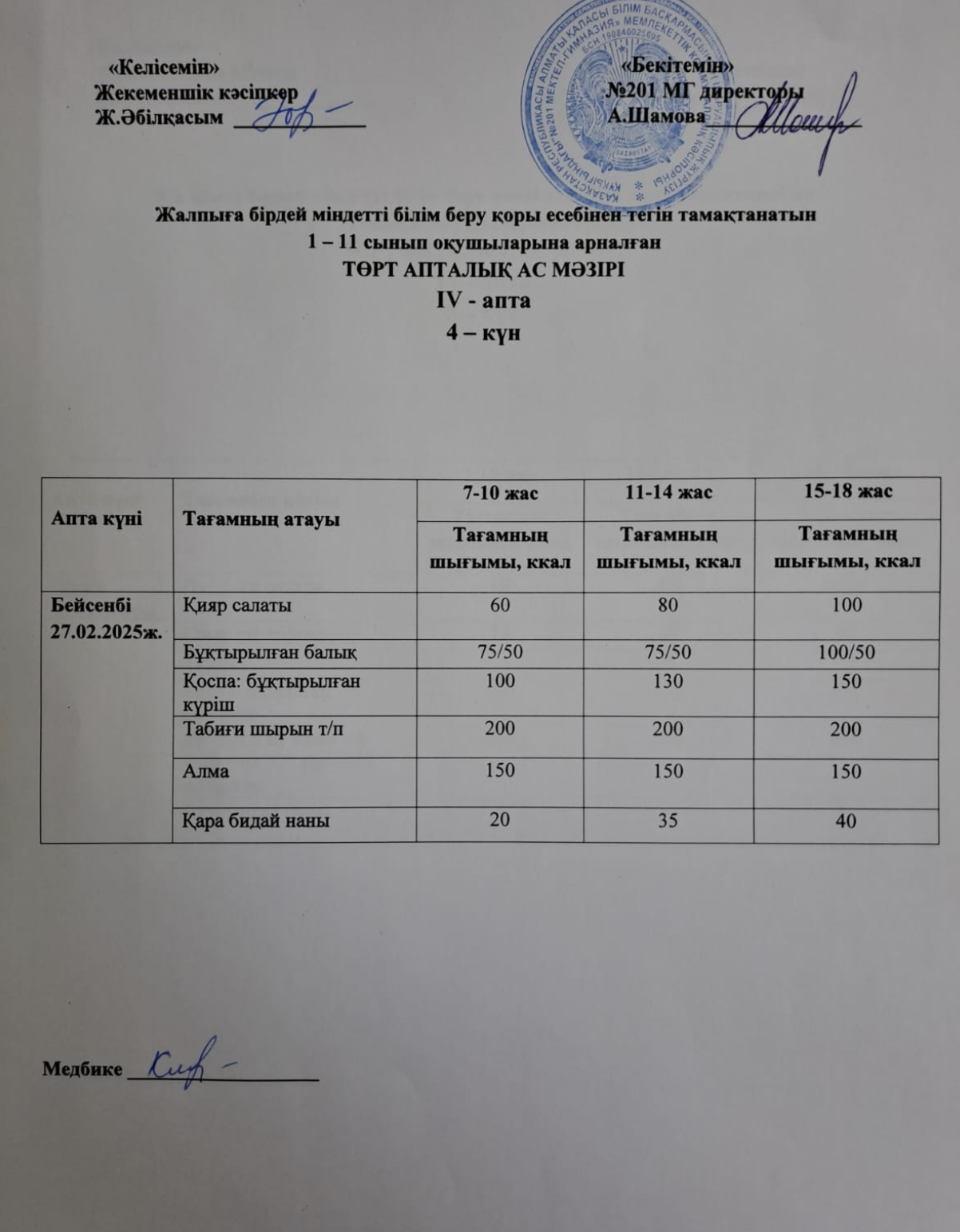 27 февраль 2025 0 1 2 3 4 5 Жалпыға бірдей міндетті білім беру қоры есебінен тегін тамақтанатын 1-11 сынып оқушыларына арналған ас мәзірі
