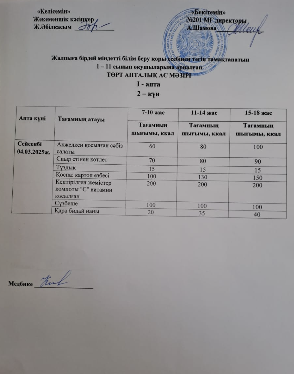 04 март 2025 0 1 2 3 4 5 Жалпыға бірдей міндетті білім беру қоры есебінен тегін тамақтанатын 1-11 сынып оқушыларына арналған ас мәзірі