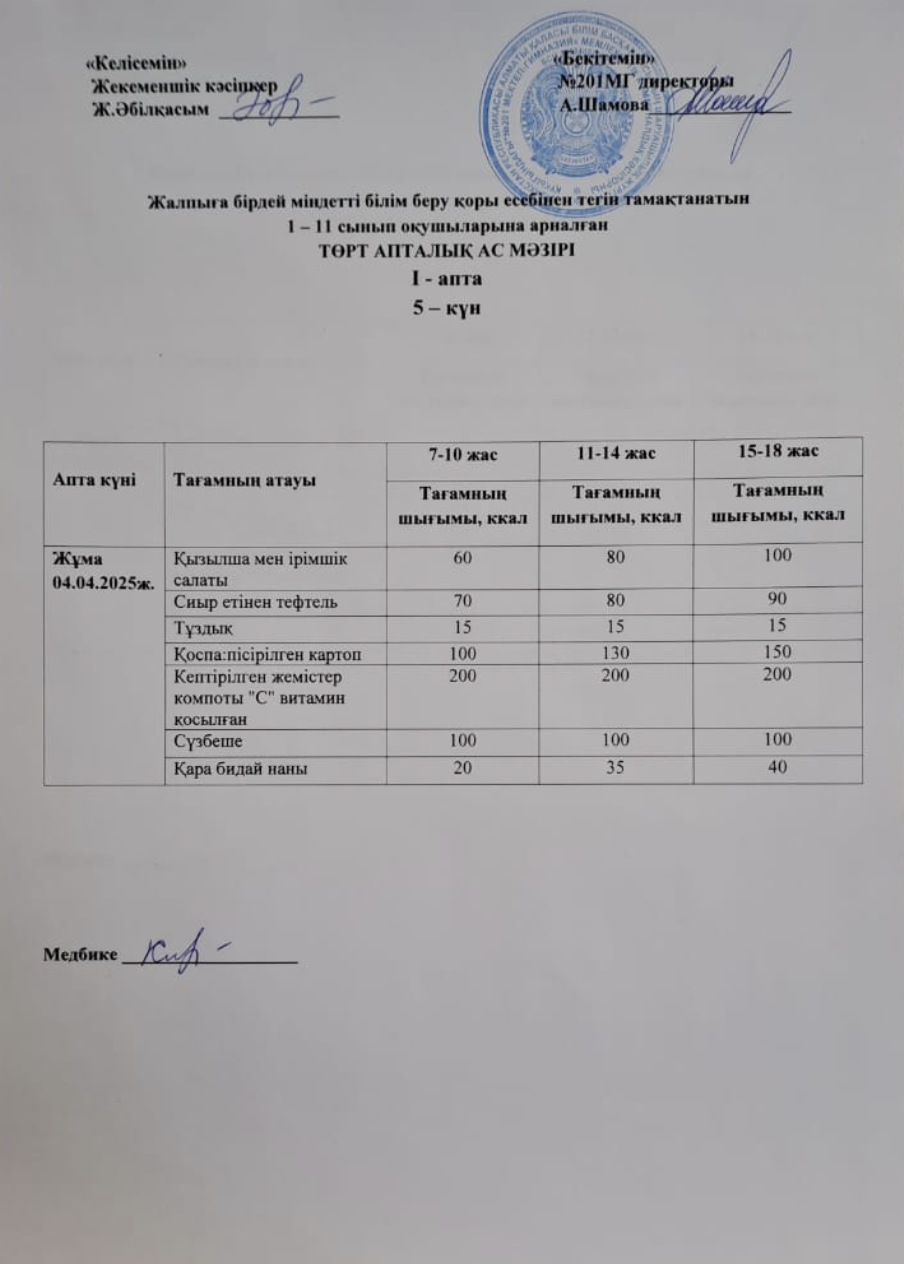 04 апрель 2025 0 1 2 3 4 5 Жалпыға бірдей міндетті білім беру қоры есебінен тегін тамақтанатын 1-11 сынып оқушыларына арналған ас мәзірі