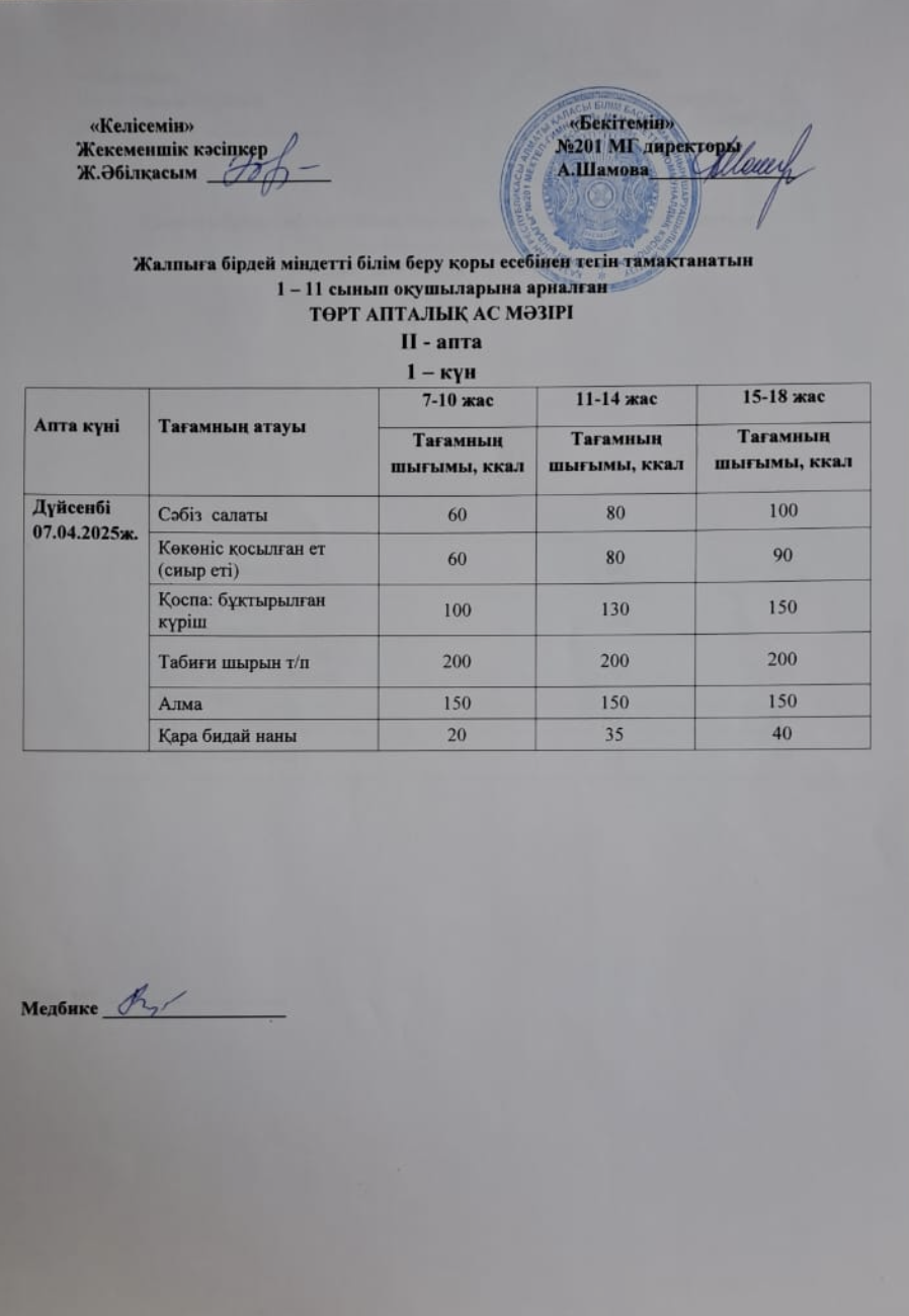 07 апрель 2025 0 1 2 3 4 5 Жалпыға бірдей міндетті білім беру қоры есебінен тегін тамақтанатын 1-11 сынып оқушыларына арналған ас мәзірі
