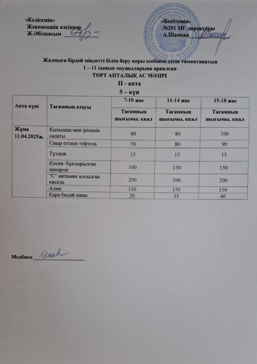 11 апрель 2025 0 1 2 3 4 5 Жалпыға бірдей міндетті білім беру қоры есебінен тегін тамақтанатын 1-11 сынып оқушыларына арналған ас мәзірі
