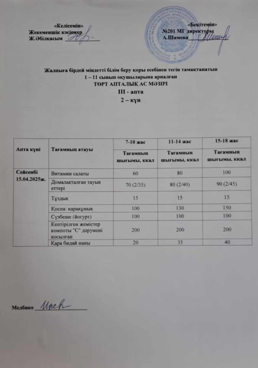 15 апрель 2025 0 1 2 3 4 5 Жалпыға бірдей міндетті білім беру қоры есебінен тегін тамақтанатын 1-11 сынып оқушыларына арналған ас мәзірі