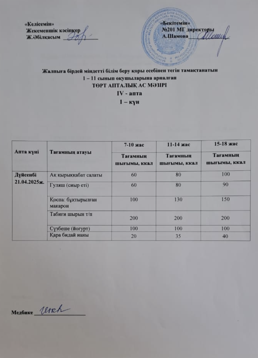 21 апрель 2025 0 1 2 3 4 5 Жалпыға бірдей міндетті білім беру қоры есебінен тегін тамақтанатын 1-11 сынып оқушыларына арналған ас мәзірі