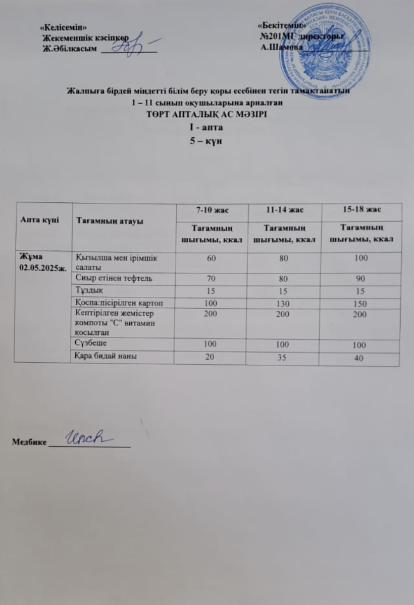 02 май 2025 0 1 2 3 4 5 Жалпыға бірдей міндетті білім беру қоры есебінен тегін тамақтанатын 1-11 сынып оқушыларына арналған ас мәзірі