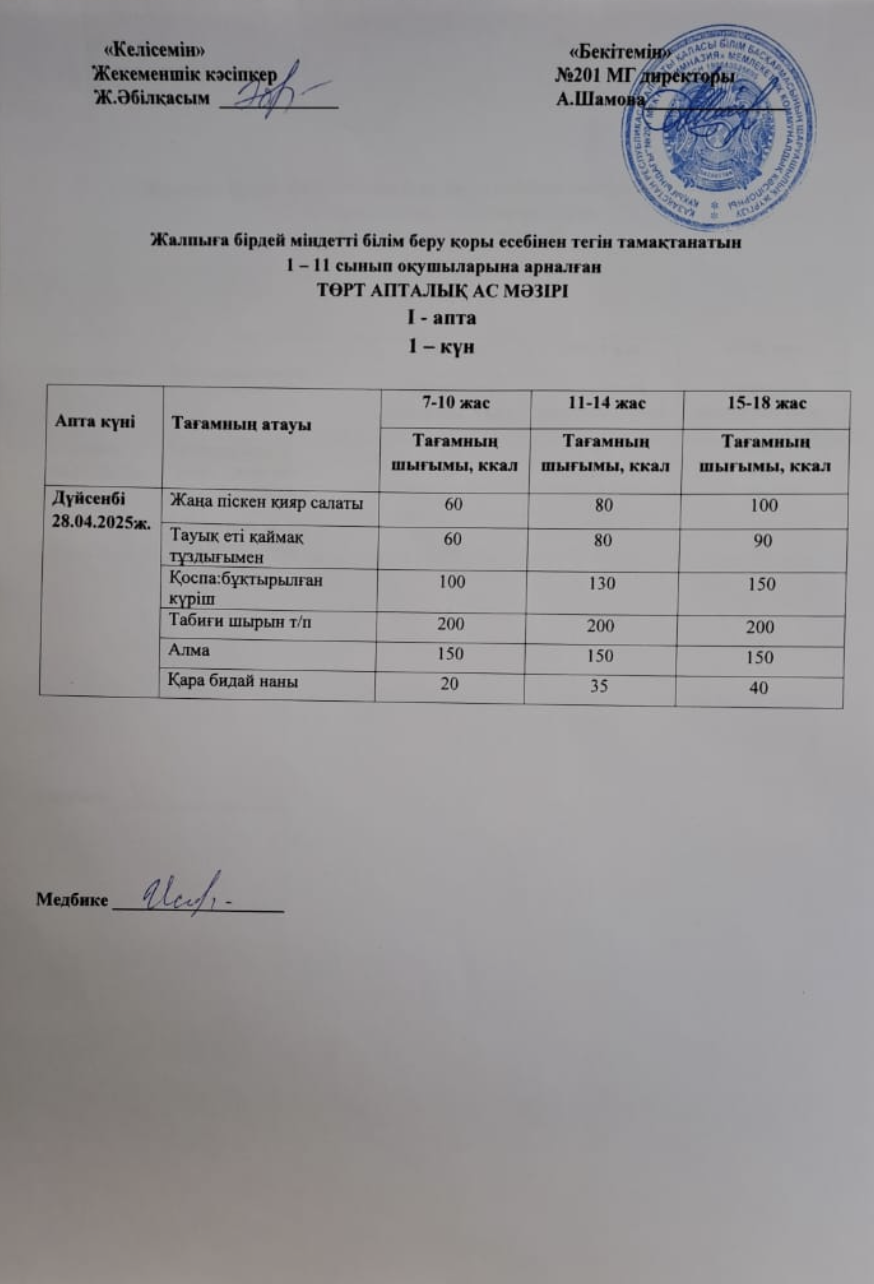 28 апрель 2025 0 1 2 3 4 5 Жалпыға бірдей міндетті білім беру қоры есебінен тегін тамақтанатын 1-11 сынып оқушыларына арналған ас мәзірі