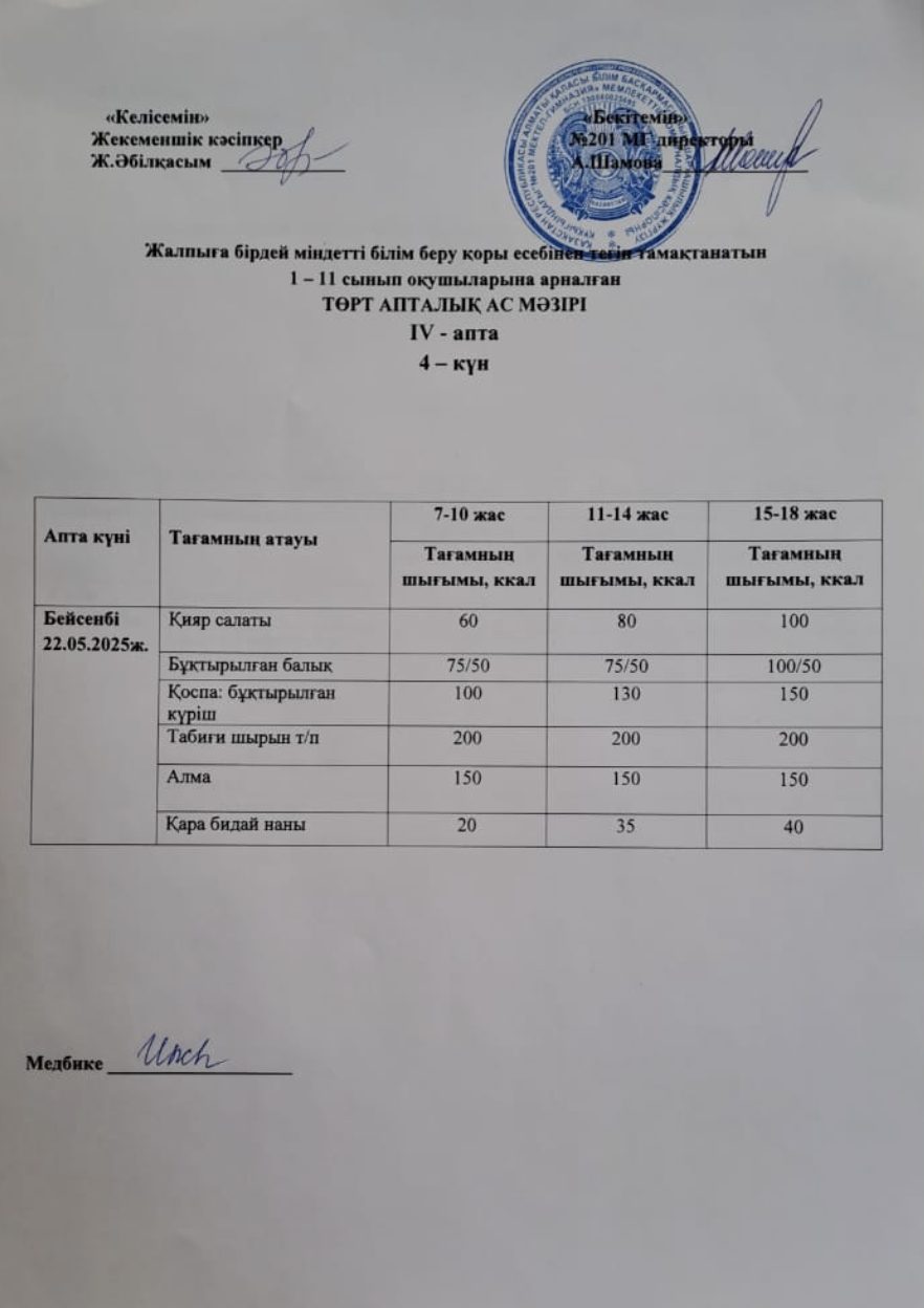 22 май 2025 0 1 2 3 4 5 Жалпыға бірдей міндетті білім беру қоры есебінен тегін тамақтанатын 1-11 сынып оқушыларына арналған ас мәзірі