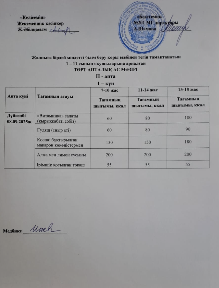 08 сентябрь 2025 0 1 2 3 4 5 Жалпыға бірдей міндетті білім беру қоры есебінен тегін тамақтанатын 1-11 сынып оқушыларына арналған ас мәзірі