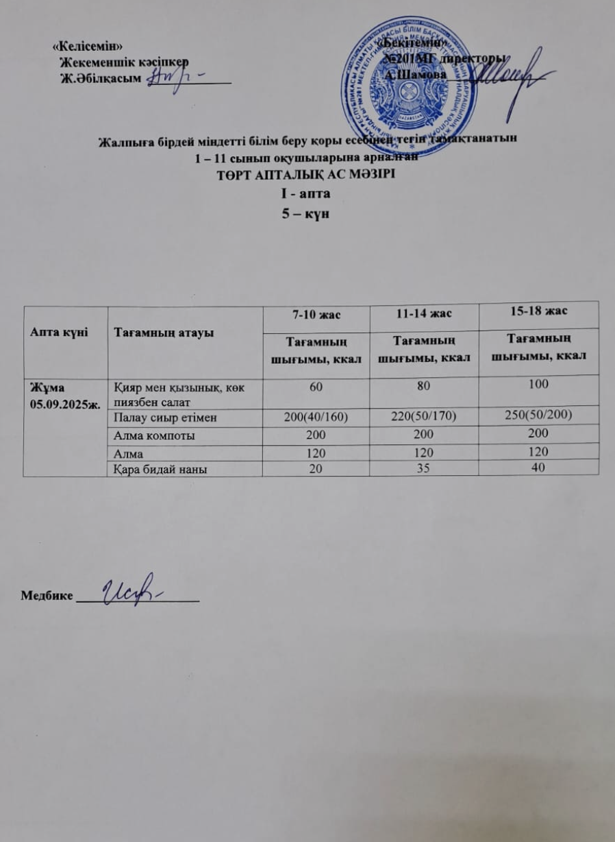 05 сентябрь 2025 0 1 2 3 4 5 Жалпыға бірдей міндетті білім беру қоры есебінен тегін тамақтанатын 1-11 сынып оқушыларына арналған ас мәзірі