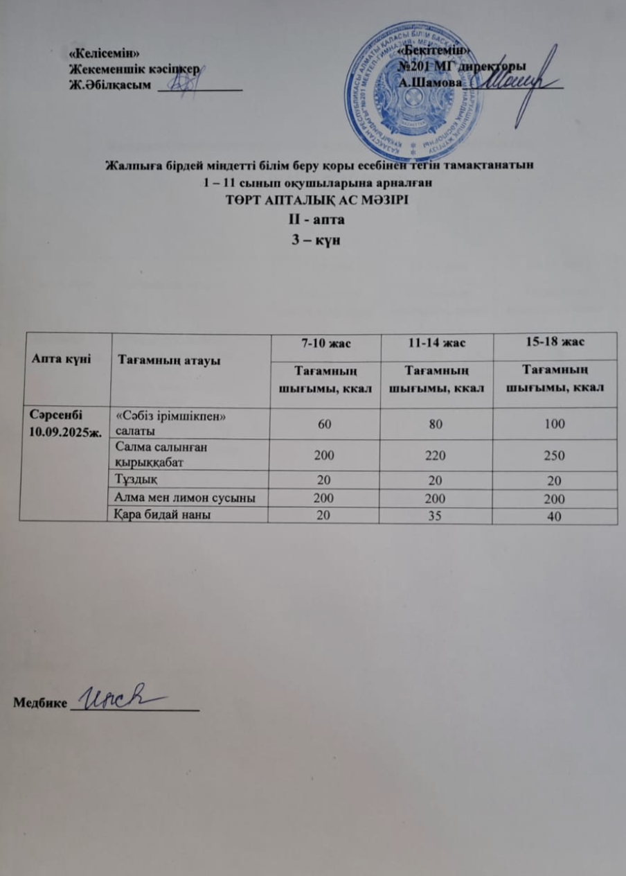 10 сентябрь 2025 0 1 2 3 4 5 Жалпыға бірдей міндетті білім беру қоры есебінен тегін тамақтанатын 1-11 сынып оқушыларына арналған ас мәзірі