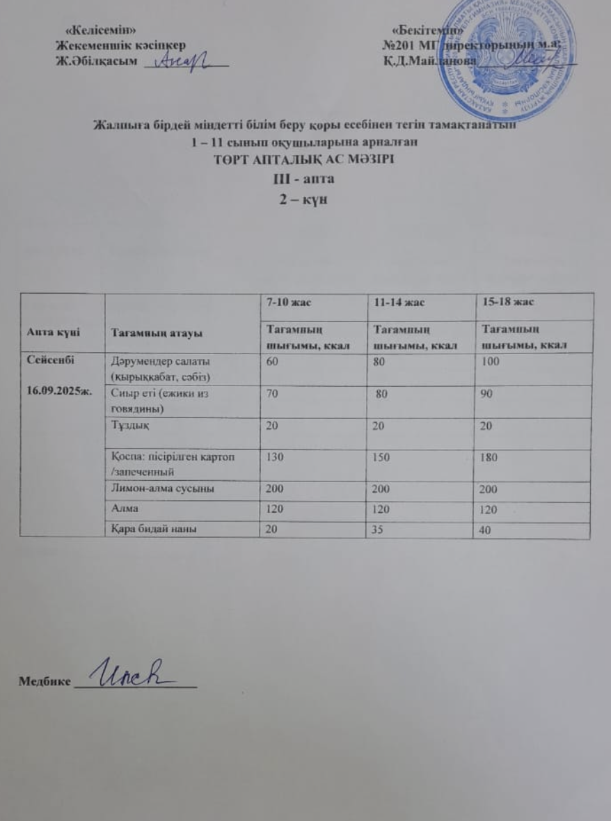 16 сентябрь 2025 0 1 2 3 4 5 Жалпыға бірдей міндетті білім беру қоры есебінен тегін тамақтанатын 1-11 сынып оқушыларына арналған ас мәзірі