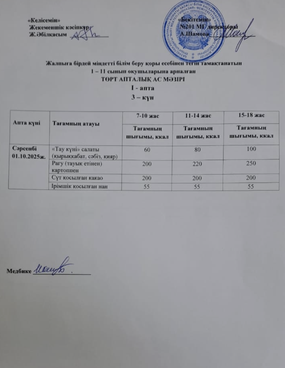 01 октябрь 2025 0 1 2 3 4 5 Жалпыға бірдей міндетті білім беру қоры есебінен тегін тамақтанатын 1-11 сынып оқушыларына арналған ас мәзірі