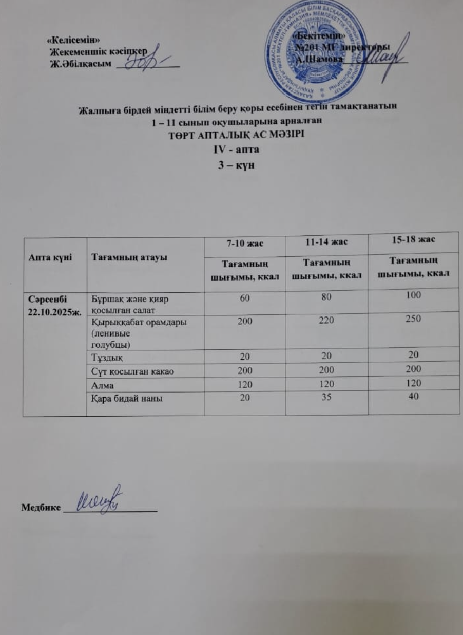 22 октябрь 2025 0 1 2 3 4 5 Жалпыға бірдей міндетті білім беру қоры есебінен тегін тамақтанатын 1-11 сынып оқушыларына арналған ас мәзірі