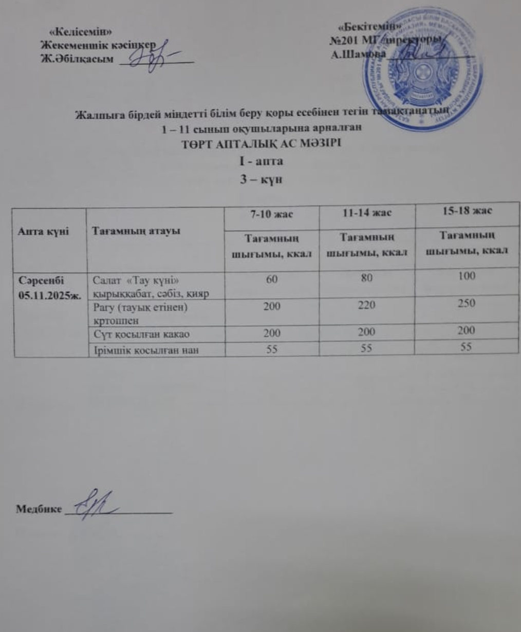 05 ноябрь 2025 0 1 2 3 4 5 Жалпыға бірдей міндетті білім беру қоры есебінен тегін тамақтанатын 1-11 сынып оқушыларына арналған ас мәзірі