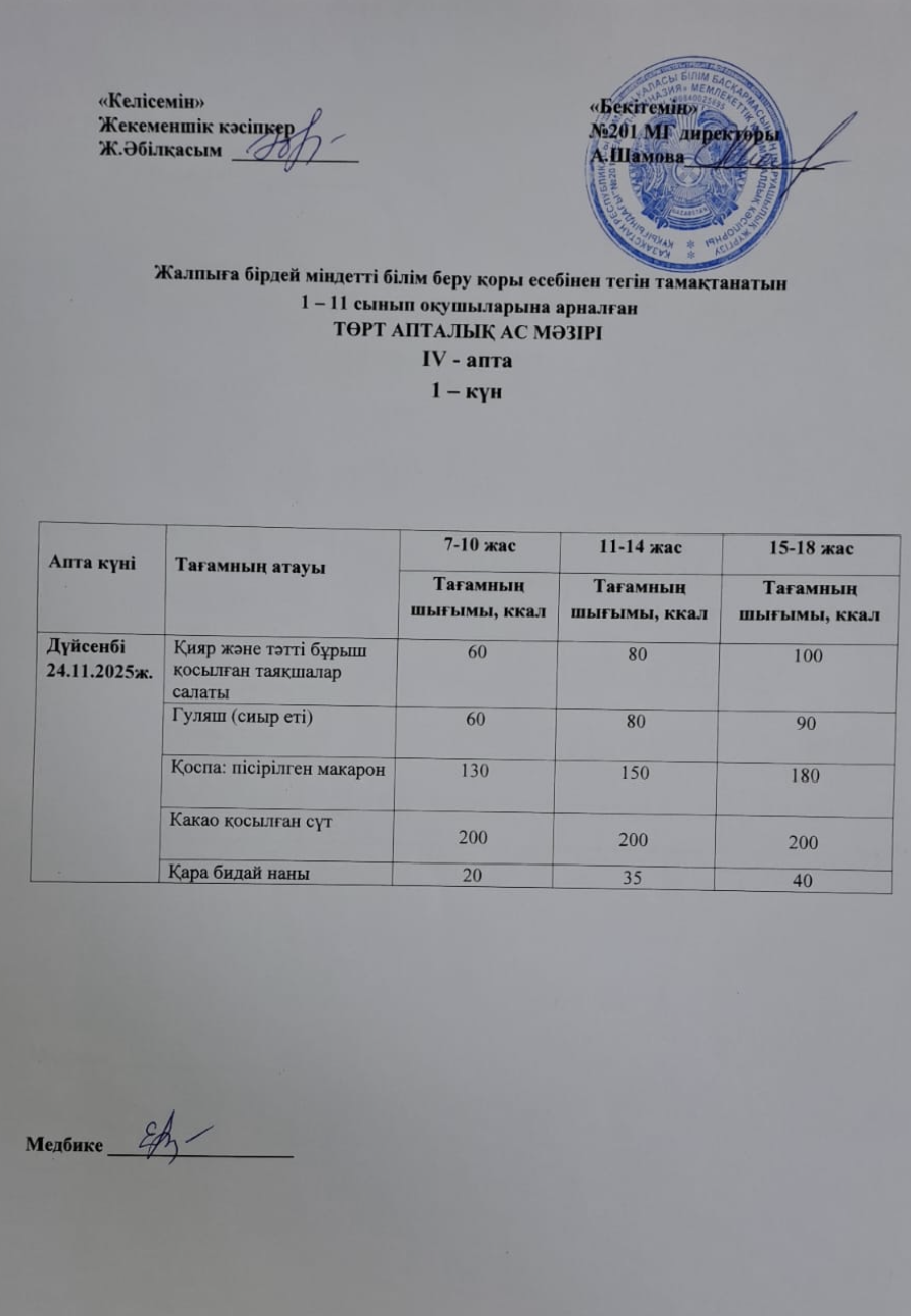 24 ноябрь 2025 0 1 2 3 4 5 Жалпыға бірдей міндетті білім беру қоры есебінен тегін тамақтанатын 1-11 сынып оқушыларына арналған ас мәзірі