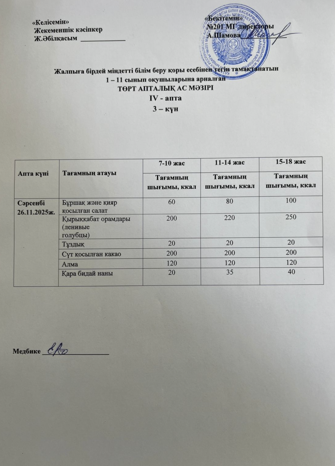 26 ноябрь 2025 0 1 2 3 4 5 Жалпыға бірдей міндетті білім беру қоры есебінен тегін тамақтанатын 1-11 сынып оқушыларына арналған ас мәзірі