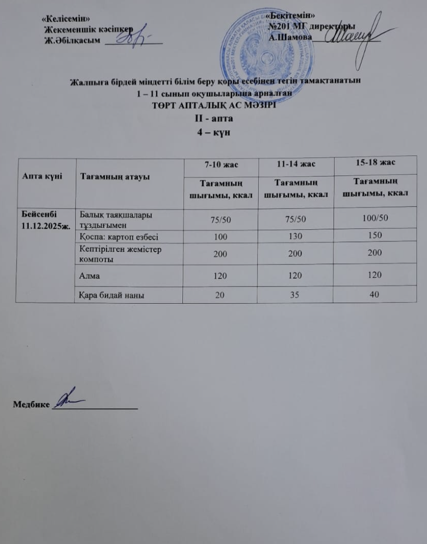11 декабрь 2025 0 1 2 3 4 5 Жалпыға бірдей міндетті білім беру қоры есебінен тегін тамақтанатын 1-11 сынып оқушыларына арналған ас мәзірі