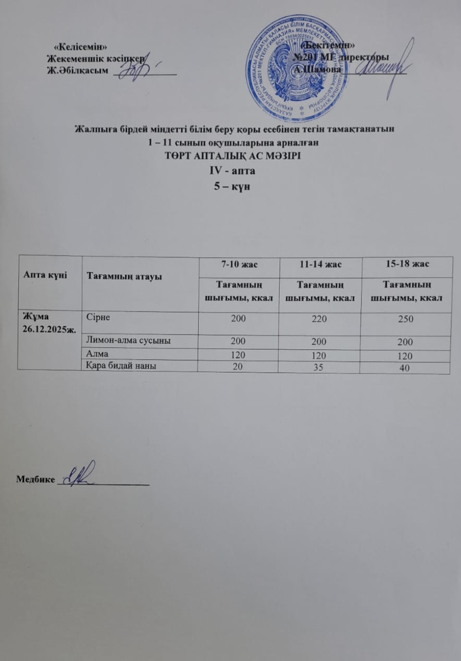 26 декабрь 2025 0 1 2 3 4 5 Жалпыға бірдей міндетті білім беру қоры есебінен тегін тамақтанатын 1-11 сынып оқушыларына арналған ас мәзірі
