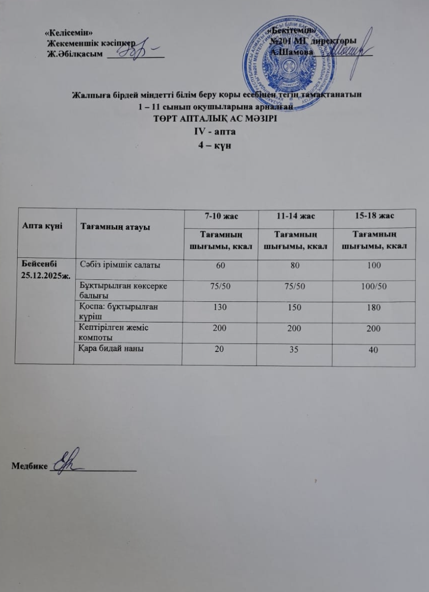 25 декабрь 2025 0 1 2 3 4 5 Жалпыға бірдей міндетті білім беру қоры есебінен тегін тамақтанатын 1-11 сынып оқушыларына арналған ас мәзірі