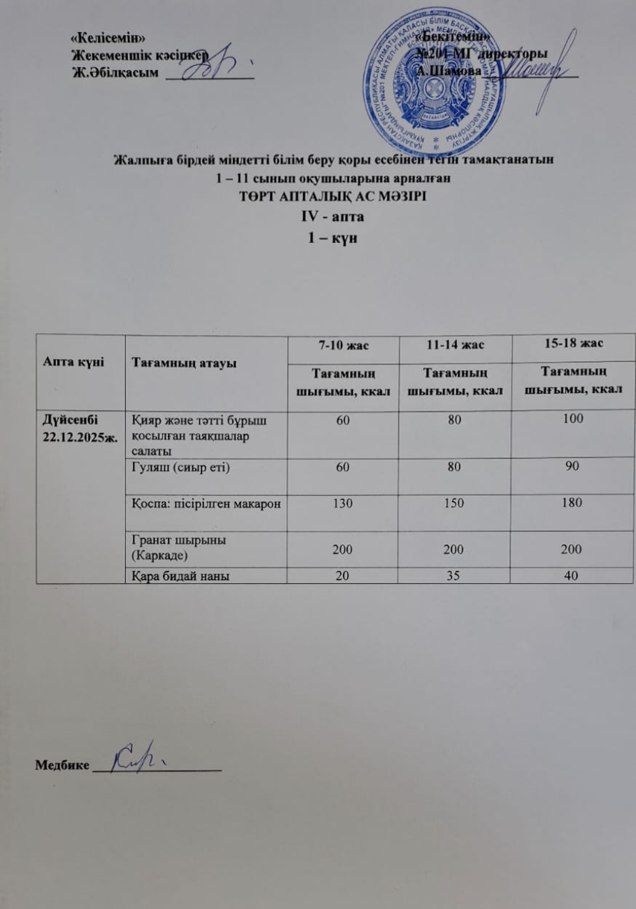 22 декабрь 2025 0 1 2 3 4 5 Жалпыға бірдей міндетті білім беру қоры есебінен тегін тамақтанатын 1-11 сынып оқушыларына арналған ас мәзірі