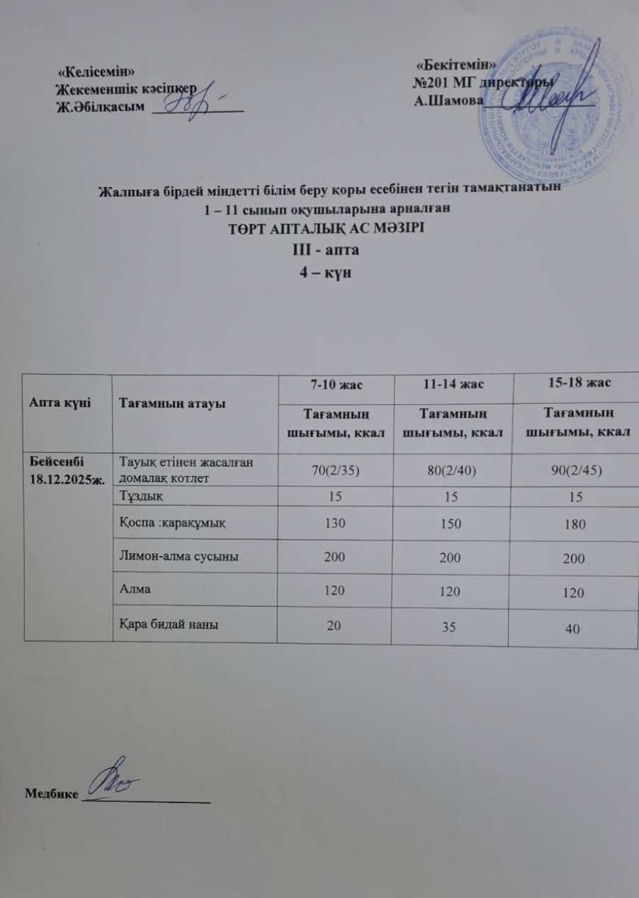 18 декабрь 2025 0 1 2 3 4 5 Жалпыға бірдей міндетті білім беру қоры есебінен тегін тамақтанатын 1-11 сынып оқушыларына арналған ас мәзірі